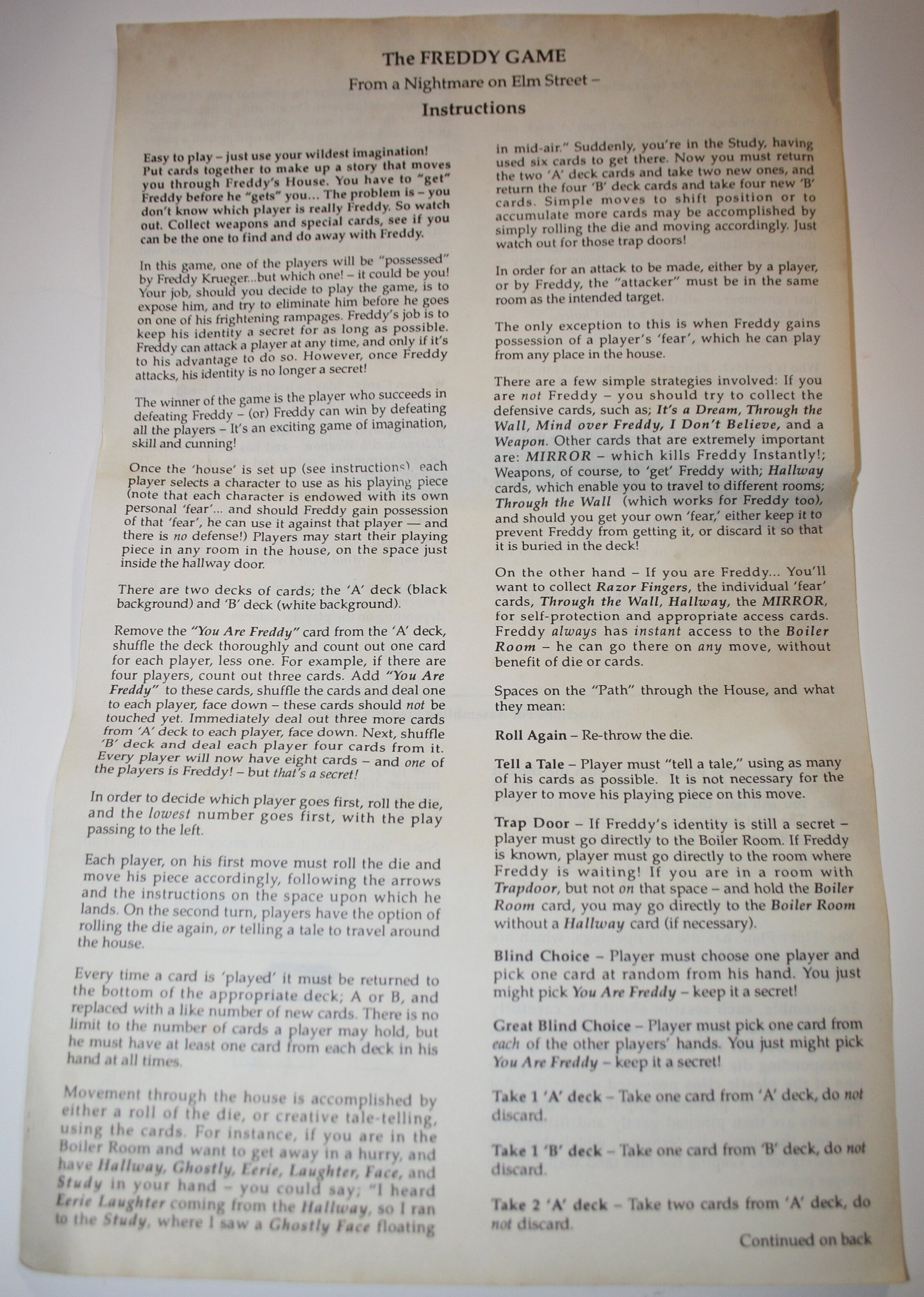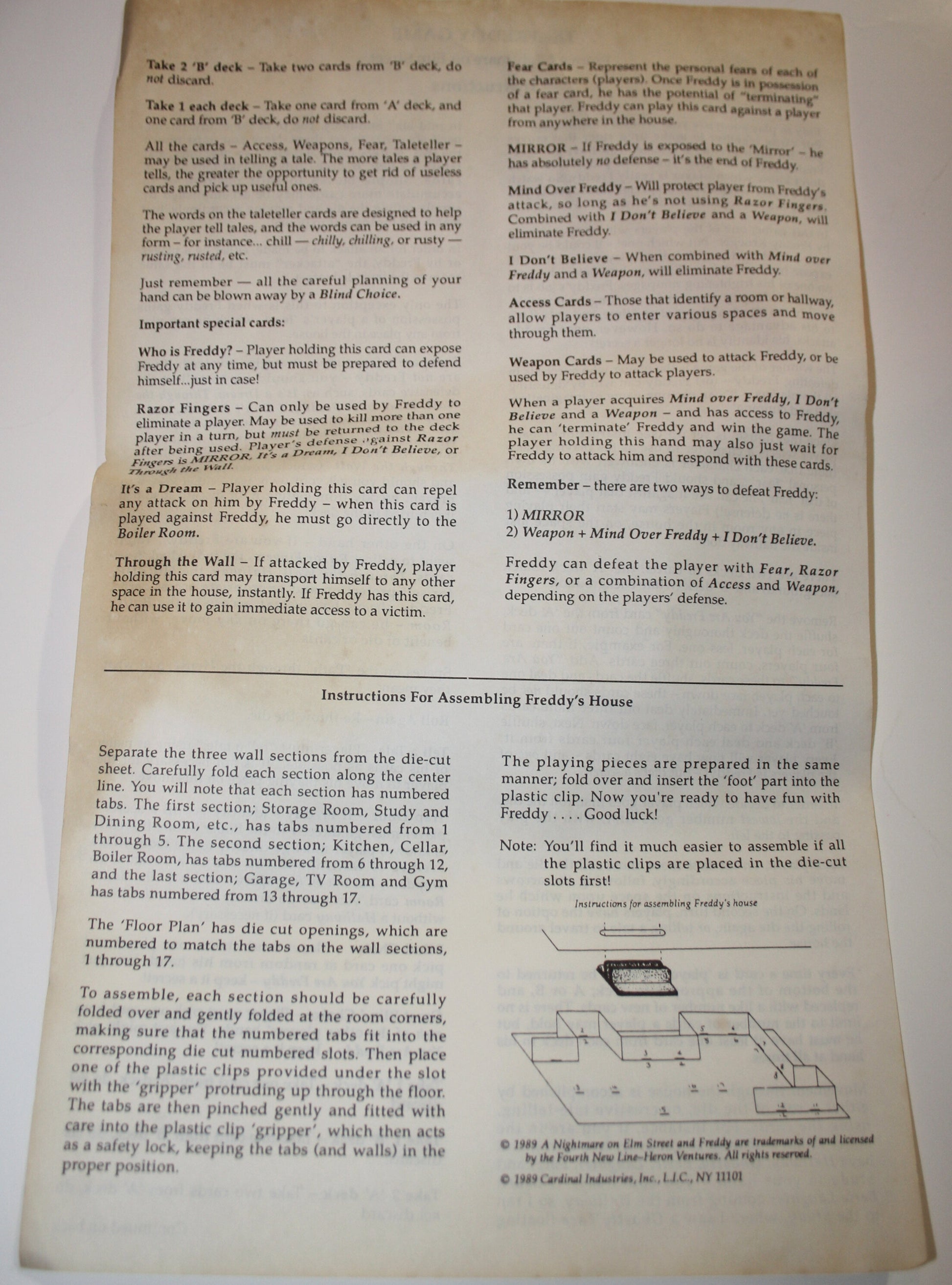This game is complete and includes: Gameboard, 3 Walls, 8 cardboard Character playing pieces, cardboard Freddy playing piece, 52 black-backed Cards, 58 white-backed Cards, die & instructions.